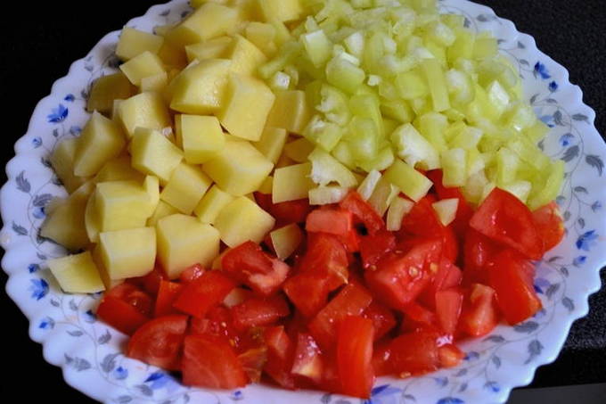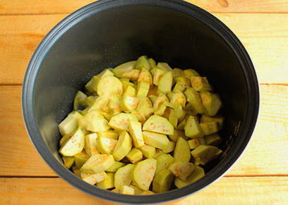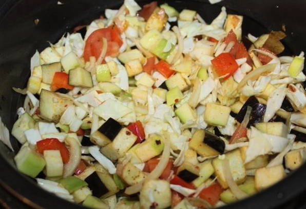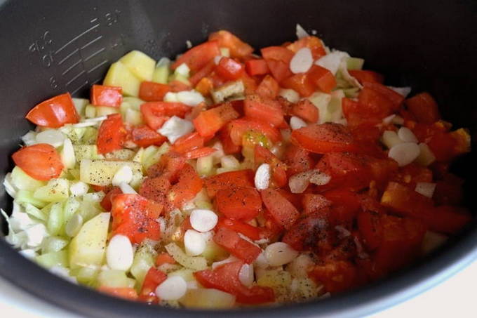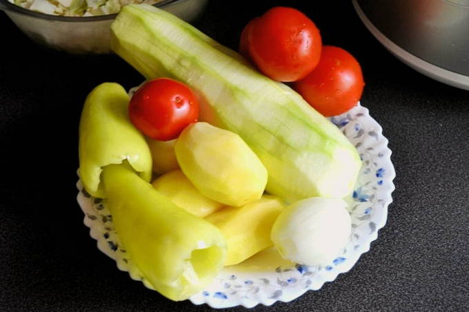 - We doen groenten in een slowcooker. Voeg eerst de courgette toe, dan de aardappelen, kool, paprika, tomaten en knoflook. Niet mengen. Zout en peper naar smaak en stel de "Stew" -modus in voor een uur.