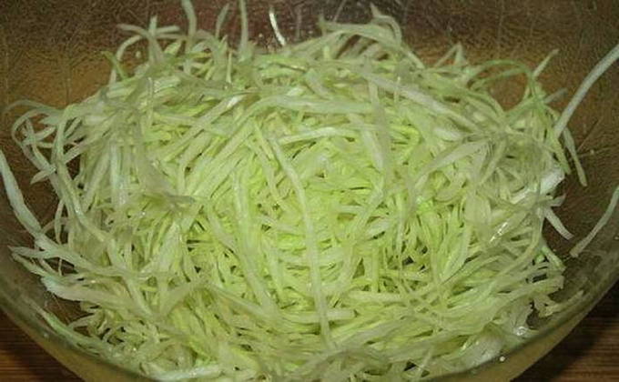- Snijd de kool fijn, schil de peper uit de zaaddoos en snij in kleine blokjes.