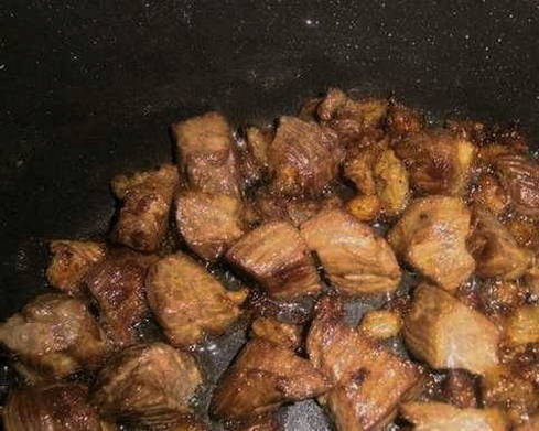 - We reinigen het varkensvlees van de aderen, in stukjes gesneden. Giet de olie in de multicooker, selecteer de "Fry" -modus en bak het vlees gedurende 10 minuten.