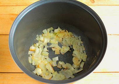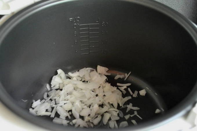 - Giet de olie in de multicooker-kom, doe de ui daar, selecteer de "Fry" -modus en bak de ui in 5 minuten goudbruin.
