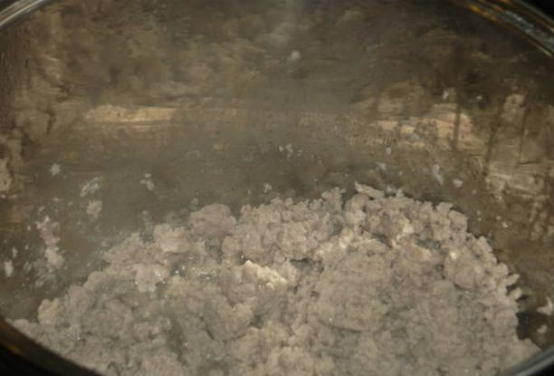 - Giet plantaardige olie in de kom van de multikoker en leg daar het gehakt. We stellen de "Fry" -modus in op 10 minuten.