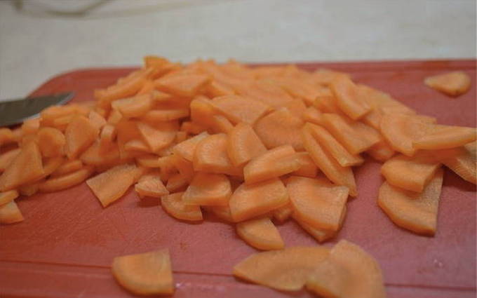 - Snijd de wortel in vieren, snij de kool in reepjes.