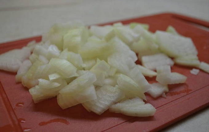 - Snijd de uien dun.