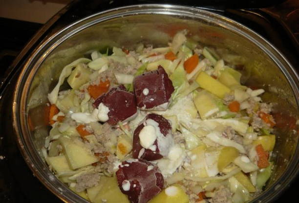 - We mengen alle ingrediënten, zout en peper naar smaak, en voegen ook zure room, tomatenpuree toe en vullen alles met water.