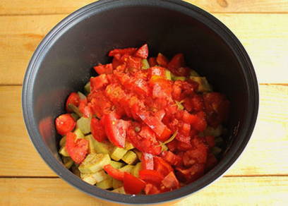 - Voeg als laatste de tomaten toe. Zout- en pepergroenten, sluit de multicooker, stel de "Stew" -modus in op een half uur en start het programma.