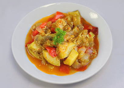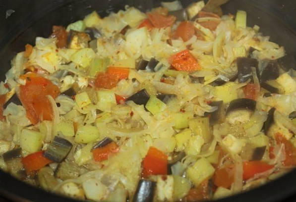 - Sappige stoofpot met aubergine en courgette in een slowcooker