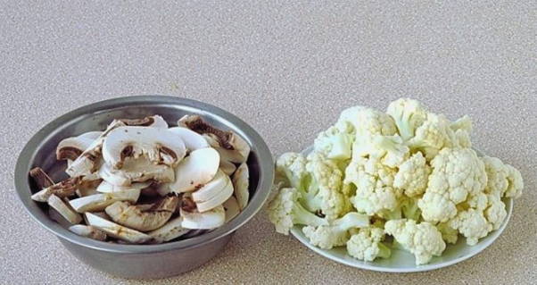 - We demonteren de bloemkool in bloeiwijzen, schillen de champignons en snijden ze in dunne plakjes.