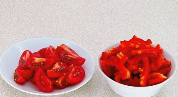 - We maken de paprika's van de stengel schoon en snijden ze vervolgens in blokjes. Snijd de cherrytomaatjes in plakjes.