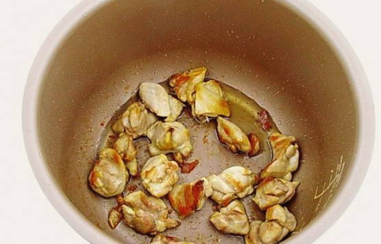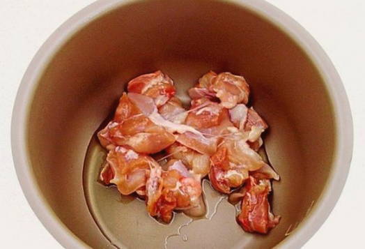 - Giet de zonnebloemolie in de multicookerkom en voeg de kip toe.