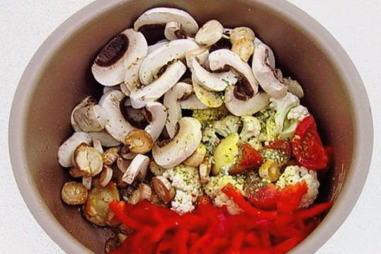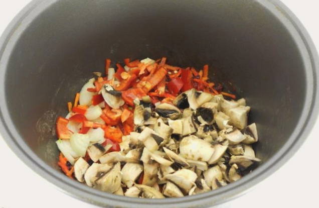 - Snijd de paprika in reepjes en de champignons in grote stukken. Voeg alles toe aan de multicooker en kook, al roerend, nog 10 minuten in dezelfde modus.