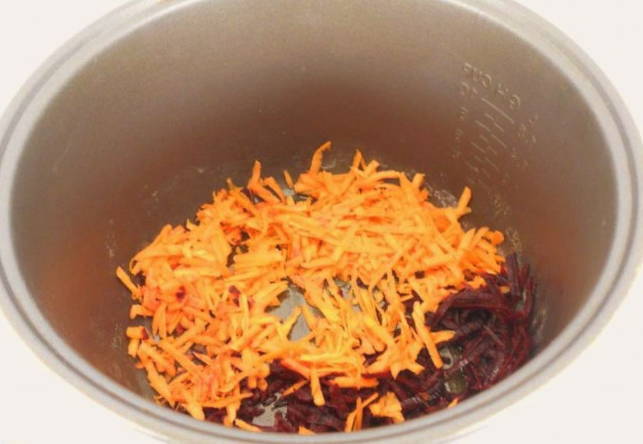 - Giet plantaardige olie in de kom van de multikoker, voeg geraspte wortelen en bieten toe.We kiezen het programma "Fry" voor 10 minuten.
