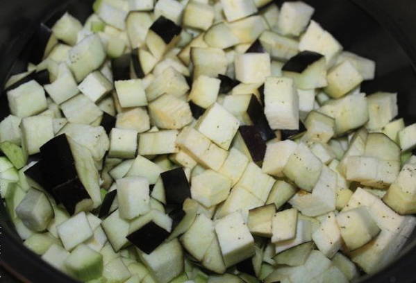 - Week de aubergines ongeveer 5 minuten in gezouten water en doe ze daarna ook in een slowcooker.