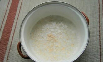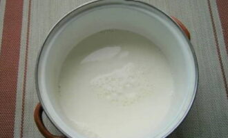 Giet melk in een pan, zet in brand, voeg zout en suiker toe, breng aan de kook.
