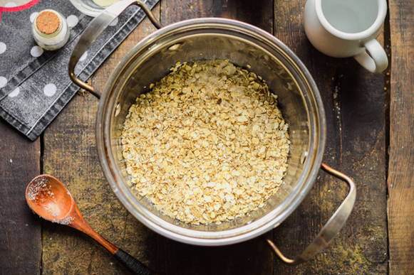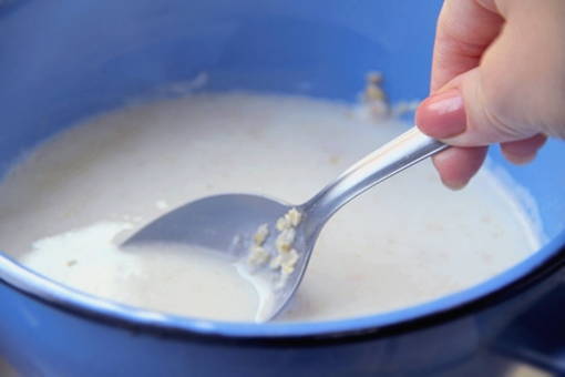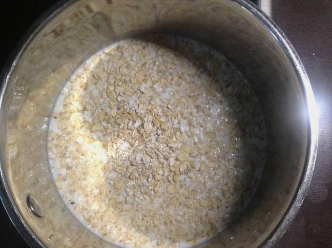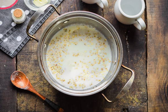 - Spoel de havermout af onder stromend water. Kook de granen 5 minuten in water, giet dan de melk erbij, voeg zout toe en kook de pap nog 7-10 minuten op laag vuur.
