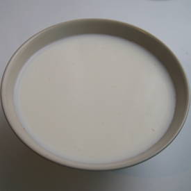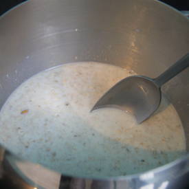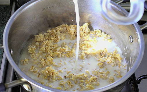 - Giet melk in een pan, verwarm deze en voeg de vlokken toe.
