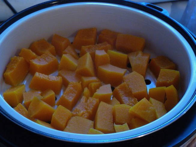 - Schil de pompoen, snij in blokjes en stoom 20 minuten.
