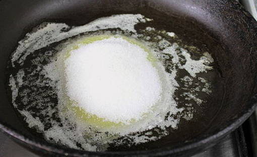 - Smelt de boter in een koekenpan, voeg suiker toe, roer en blijf verwarmen tot het mengsel een aangename gouden tint krijgt.