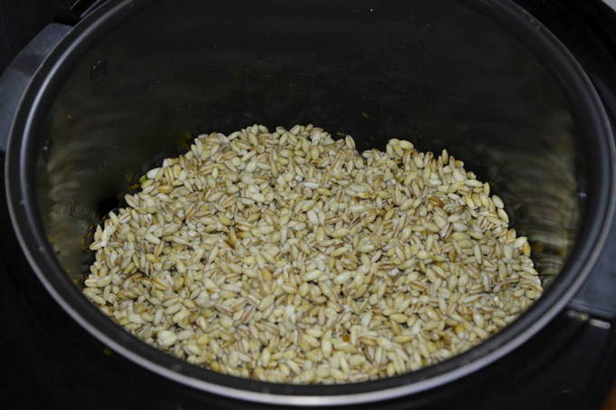 - Giet vervolgens het water af, doe de granen in de multikoker, voeg zout en suiker toe.