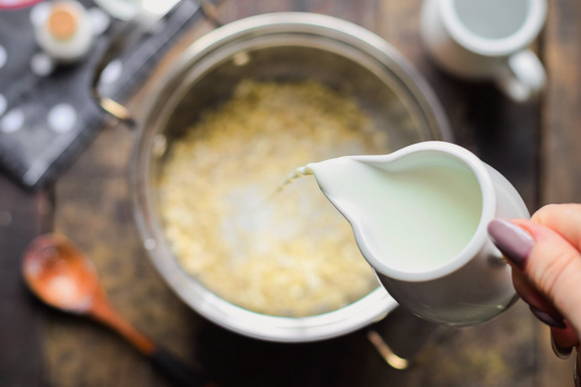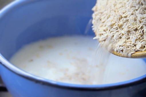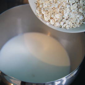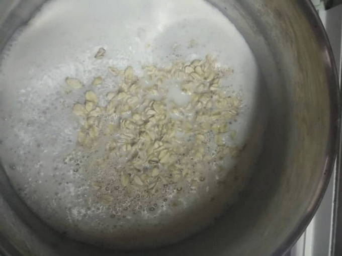 - Zodra de melk begint te koken, voeg je de havermout toe.