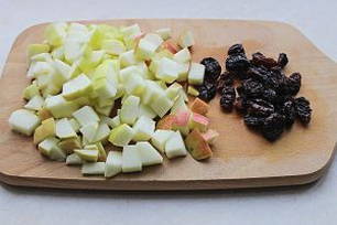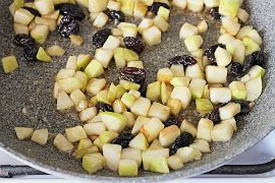 - Smelt boter in een koekenpan, voeg rozijnen en appels toe, voeg kruiden toe, bak de ingrediënten op laag vuur tot de appels zacht zijn.