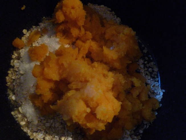 - Vet een kom van een multikoker in met plantaardige olie, voeg havermout, zout en suiker toe, voeg pompoenpuree toe.