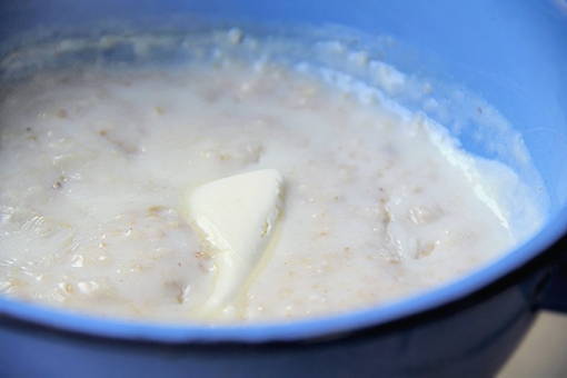 - Voeg vervolgens de boter toe aan de pap, roer en laat de havermout 5 minuten onder het deksel trekken.