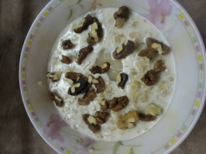 - Voeg ook nog walnoten naar smaak toe en een heerlijk ontbijt van gezonde havermout is klaar.