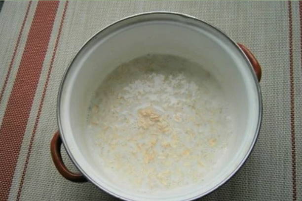 - Giet melk in een pan, verwarm deze en voeg de vlokken toe.