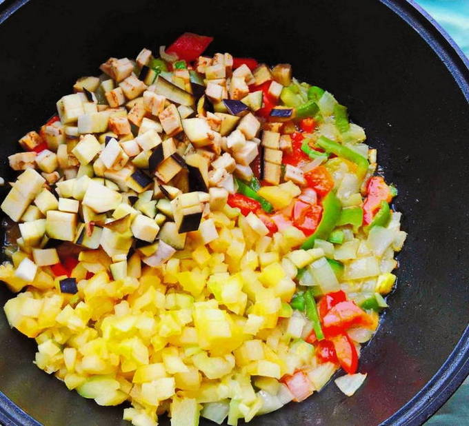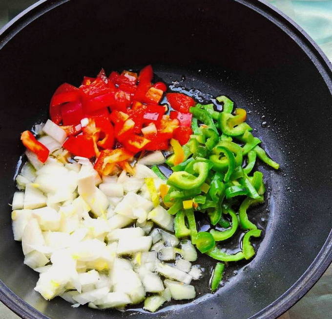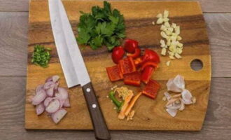 - Snijd de paprika, ui en knoflook fijn. We sturen producten naar een koekenpan met plantaardige olie.