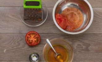 Snijd de tomaat doormidden en rasp ze. Giet de saffraan met een kleine hoeveelheid kokend water en laat 5 minuten staan.