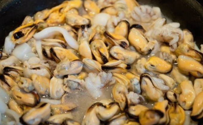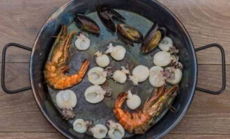 We verhitten een koekenpan met olijfolie. We doen er gamba's en andere zeevruchten in. We bakken ze 2-3 minuten. Daarna leggen we de mosselen even op een bord.