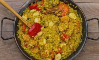 - Paella met kip en zeevruchten is klaar. Verdeel het in porties en serveer.