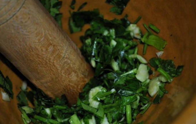- Snipper de knoflook, sjalotten en peterselie. We kneden de kruiden in een vijzel.