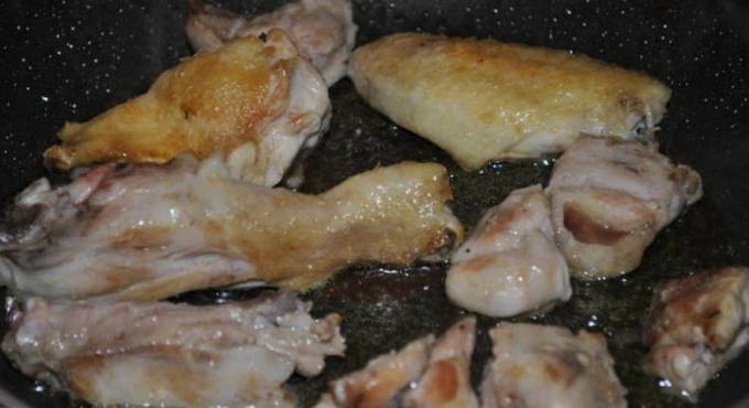 - Snijd de kippendij in kleine stukjes. Bak ze in plantaardige olie tot ze blozend zijn.
