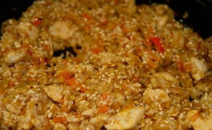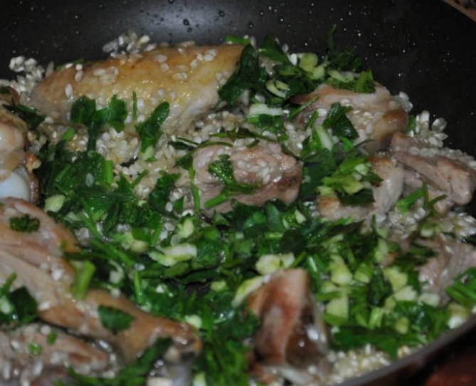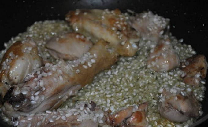 - We leggen de kip terug in het gerecht. Doe hier rijst en vul deze met witte wijn. Roer tot het verdampt.