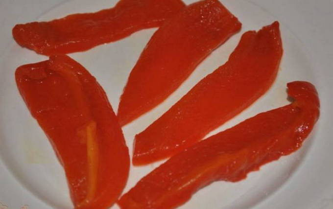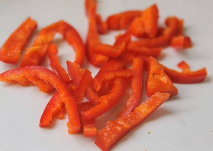 - Laten we op dit moment beginnen met het snijden van groenten. Snijd de paprika in dunne reepjes.