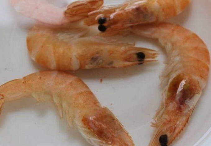 Kook de garnalen. We verwijderen voorzichtig hun binnenkant, zonder de schaal te verwijderen.