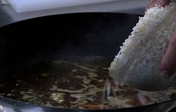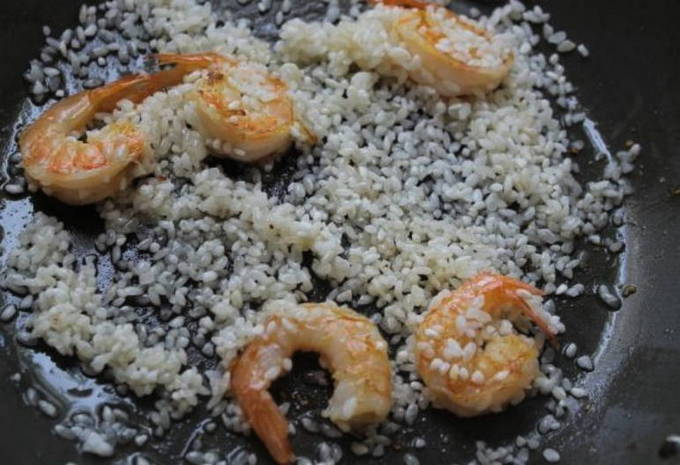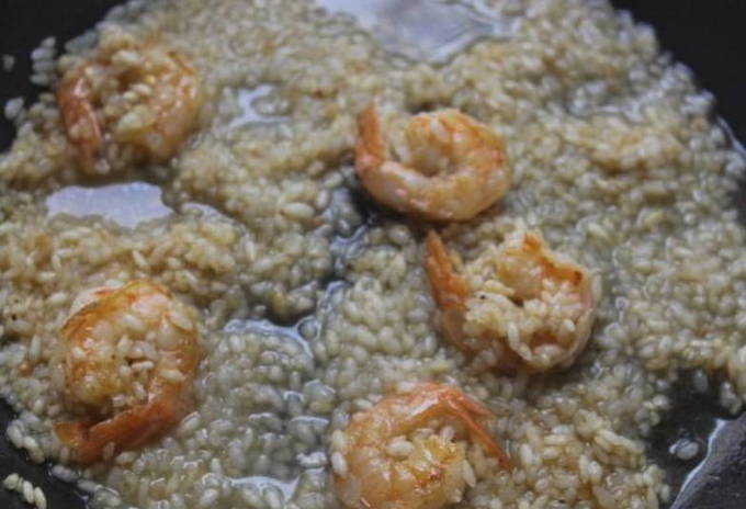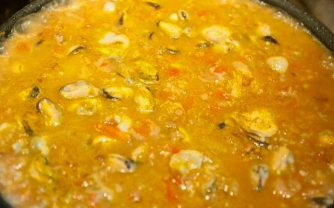 Doe rijst en geraspte tomaten in een koekenpan. Giet de inhoud met saffraan en water, evenals de bouillon die overblijft van de garnalen. Voeg zout en kruiden toe. Kook gedurende 15 minuten op laag vuur.