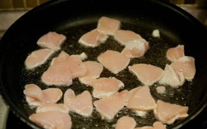 - Snijd de kipfilet in kleine stukjes. Bak ze in een pan in olijfolie.