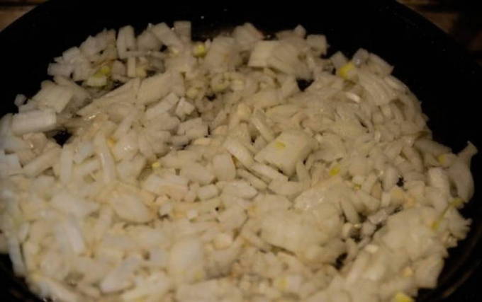 - We verwijderen het gefrituurde vlees een tijdje en in dezelfde pan bereiden we gesnipperde ui met knoflook.