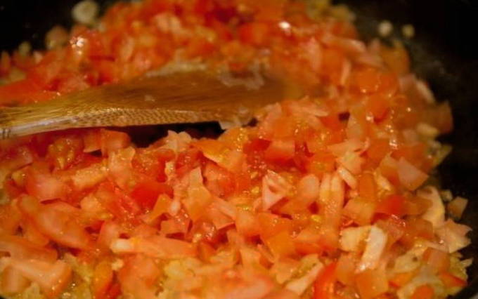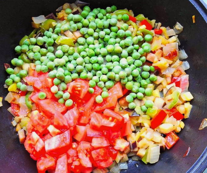 - Voeg erwtjes en plakjes tomaat toe. We laten 5-7 minuten sudderen.