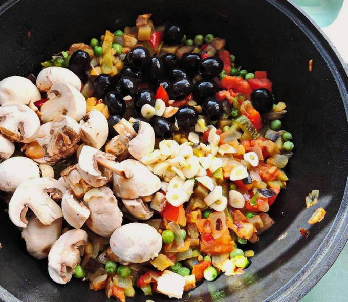 - De totale massa vullen we aan met stukjes champignons en olijven. We blijven nog 5 minuten frituren.