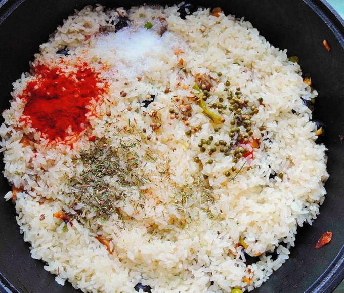 - Voeg de gewassen rijst toe aan het gerecht. Bestrooi het met zout en kruiden.