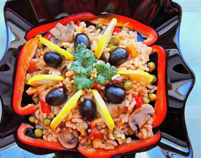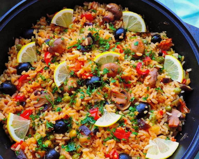 - Sappige paella met champignons is klaar. Garneer met partjes citroen en gehakte groene uien.