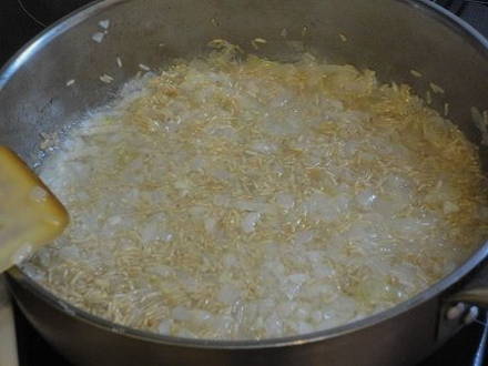 - Snipper de ui en knoflook en fruit ze in olijfolie. Doe hier bruine rijst en vul deze met water. We laten het in brand tot het zacht is.