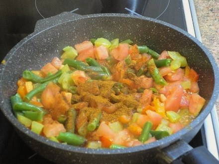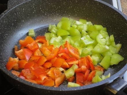 - Ook leggen we hier stukjes paprika. Laat het voedsel ongeveer 7 minuten sudderen.