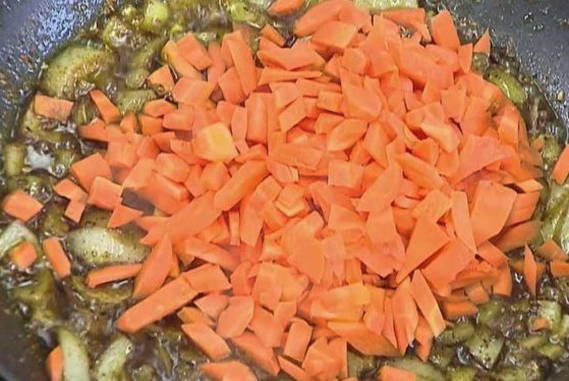 - Verwarm een koekenpan voor met olijfolie. Fruit de stukjes ui en knoflook en voeg ze toe met kleine blokjes wortel. We koken nog ongeveer 5 minuten.