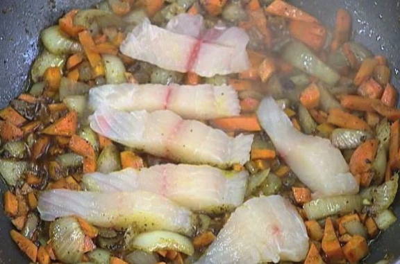- Ook leggen we hier kleine stukjes tomaten en paprika's. We sudderen nog 5 minuten en voegen zeevruchten toe aan de massa.