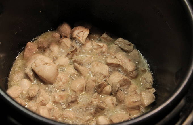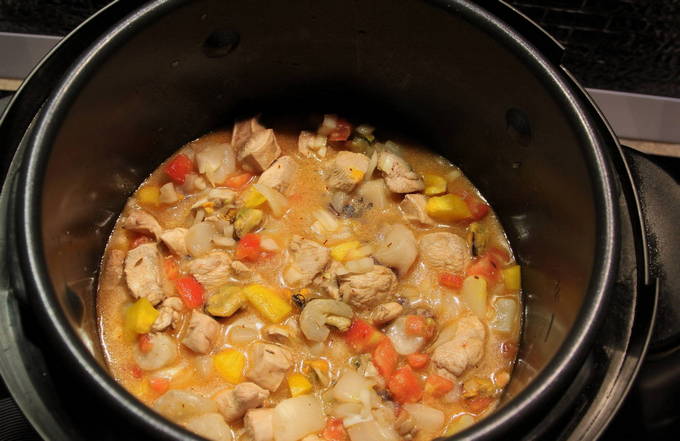 - We zetten de multicooker aan in de "frituur" -modus. Schenk er olijfolie in en bak hierin de gesnipperde uien en stukjes kipfilet.