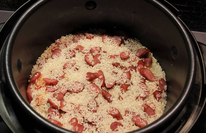 - Voeg vervolgens rijst toe met jachtworsten, voorgesneden in dunne cirkels.